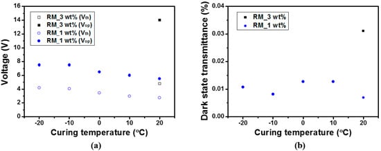(a) Threshold and operating voltages and (b) transmittance in the dark state of polymer-stabilized IPS cells with RM concentrations of 1 and 3 wt% as functions of the curing temperature.