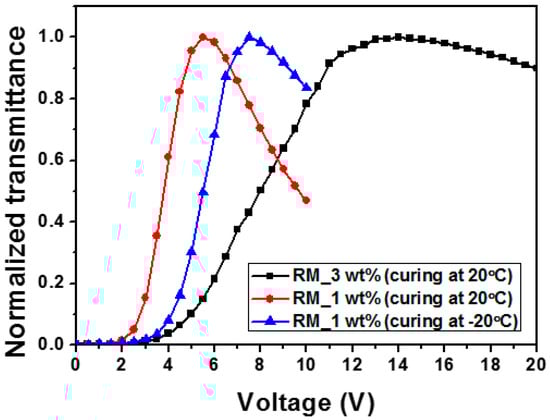 Normalized V-T curves of IPS cells fabricated by curing 1 and 3 wt% of RM at 20 °C, and 1 wt% of RM at −20 °C.