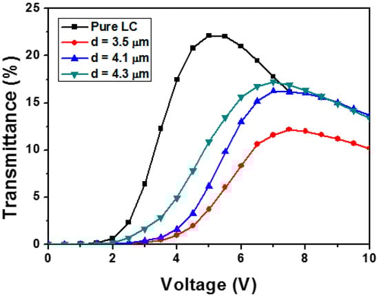 As described above, low-temperature curing of the polymer structure is more effective at reducing the response time because it can minimize the degradation of other characteristics, such as the dark-state light leakage and operating voltage, because of the low polymer concentration. Nevertheless, as the curing temperature was lowered, the transmittance severely decreased, as shown in Figure 1. To minimize the transmittance decrease, we can increase the cell gap of a polymer-stabilized LC cell [14]. We measured the V-T curves of IPS cells with 1 wt% of RM as we varied the cell gap from 3.5 to 4.3 μm, as shown in Figure 5. As the cell gap is increased, the maximum transmittance increased. When the cell gap was 4.3 μm, the maximum transmittance of the polymer-stabilized IPS cell was 17.2% at an applied in-plane voltage of 7 V, which corresponds to 77.8% of the maximum transmittance of a conventional IPS cell. Although the maximum transmittance of the polymer-stabilized IPS cell is still lower than that of a conventional IPS cell, the transmittance decrease is minimized. Although the cell gap was increased for higher transmittance, the response time remained almost constant, as shown in Table 2. In other words, the increased cell gap of a polymer-stabilized IPS cell does not sacrifice its response time because of the reduced average distance between two neighboring bundles by low-temperature curing of the polymer material. In a polymer-stabilized IPS cell, the cell-gap dependence of the response time can be reduced significantly because the anchoring strength of the polymer network becomes sufficiently large [14].
