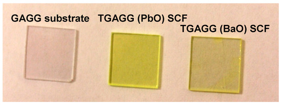 It is also important to note that the LY of Tb1.5Gd1.5Al2.5Ga2.5O12:Ce (PbO) and Tb1.5Gd1.5Al3 Ga2O12:Ce (BaO) SCFs is comparable with that in the high-quality Gd3Al2.5–2Ga2.5–3O12:Ce SC samples (Table 1 and Figure 7). This also enables producing the hybrid film-substrate detectors using the LPE method with high LY both in film and substrate scintillators with optimized contents, taking into account the requirement for the decay times of the signals coming from the film and substrate components of the hybrid scintillator differs by a factor of at least two [52]. Such a demand is fully realized in the case of Tb1.5Gd1.5Al3Ga2O12:Ce (BaO) SCF/Gd3Al2.5Ga2.5O12:Ce SC hybrid scintillators (Figure 4b). These scintillators can be proposed for different types of application, especially for registration of the components of mixed ionizing flux [52] and multi-layer screens for visualization of X-ray images [21].