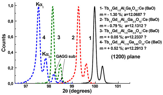 The XRD measurements (spectrometer DRON 4, CuKα X-ray source) were used for characterization of the structural quality of Tb1.5Gd1.5Al5−yGayO12:Ce SCFs, grown from BaO based flux (Figure 2). From the respective XRD patterns of these SCFs at y value in the 2–3.85 range (Figure 2), we can also estimate the lattice constants of the different garnet compositions and the misfit between the lattice constants of SCFs and GAGG substrate Δa = (aSCF − asub)/asub × 100% (Table 1). Namely, the lattice constant of Tb1.5Gd1.5Al5−yGayO12:Ce (BaO) SCFs at y = 2–3.85 changed from 12.069 Å for Tb1.5Gd1.5Al3Ga2O12:Ce SCFs to 12.2913 Å for Tb1.5Gd1.5Al1.2Ga3.8O12:Ce SCFs (Figure 2) and the value of misfit m changed from −1.3% to +0.52% for these SCF samples (Table 1).