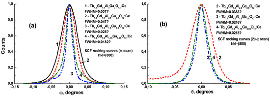 The measurements of rocking curves in the ω and 2θ-ω scanning modes were applied for characterization of the structural quality of Tb1.5Gd1.5Al5−yGayO12:Ce (BaO) SCFs at different Ga content y in the 2.0–3.85 range (Figure 3a,b, respectively). As can be seen from these figures, the quality of the SCFs, which is proportional to FWHM of rocking curves, significantly increases at lower SCF-substrate misfit values m in Tb1.5Gd1.5Al5−yGayO12:Ce (BaO) SCFs. Namely, the smallest FWHM values of 0.0182 and 0.0121 degrees are observed for Tb1.5Gd1.5Al1.5Ga3.5O12:Ce (BaO) SCFs (Figure 3a,b, respectively) grown onto GAGG substrates with the lowest SCF/substrate misfit value m = +0.05% (Table 1).