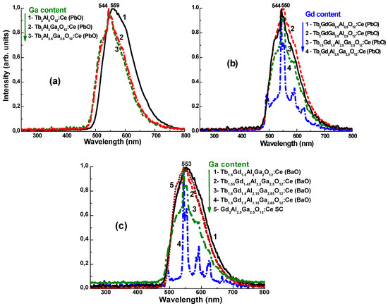 Based on the results presented in Figure 4a,b, we can confirm here that the optimal values of the Gd3+ and Ga3+ concentrations in Tb3−xGdxAl5−yGayO12:Ce SCFs are x = 1–1.5 and y = 2–2.5 ranges, respectively. At these concentrations the respective CL spectra of Tb1.5Gd1.5Al3–2.5Ga2–2.5O12:Ce (PbO) and (BaO) SCFs show the dominant Ce3+ emission band with relatively small contribution of the Tb3+ luminescence (Figure 4b, curves 2 and 3 and Figure 4c, curves 1 and 2).