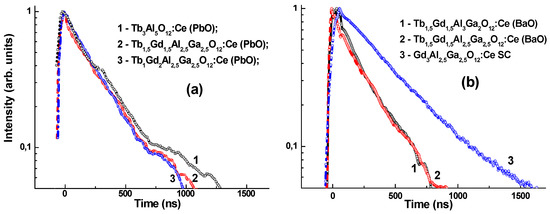 The scintillation decay kinetics of Tb3−xGdxAl5−yGayO12:Ce and Tb1.5Gd1.5Al5−yGayO12:Ce SCFs, grown both from PbO (a) and BaO (b) fluxes with different x and y values in the 0–2 and 2–2.5 ranges, respectively, are shown correspondingly in Figure 5a,b. Generally, the Tb3−xGdxAl5−yGayO12:Ce SCF scintillators demonstrate the notably slower non-exponential kinetics similarly to their YAG:Ce and LuAG:Ce SCF counterparts [21,36]. Such slower decay kinetics of the Ce3+ luminescence is typical for Tb3+ and Gd3+ based SCF scintillators, where the cascade energy transfer via both sublattices of Gd3+ and Tb3+ cations is more complicated [36] in comparison with their YAG:Ce and LuAG:Ce SCF analogues, where the direct energy transfer from the garnet host to Ce3+ ions dominates [21].