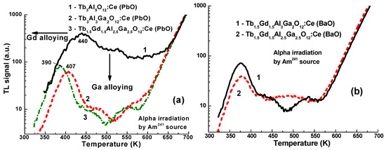 Figure 6. TSL (in the log scale) of Tb3−xGdxAl5−yGayO12:Ce (PbO) (a) with a different content of Gd3+ and Ga3+ cations (see legend of the figure) and Tb1.5Gd1.5Al3–2.5Ga2–2.5O12:Ce (BaO) (b) SCFs after irradiation by Am241 α-particles and registration of the Ce3+ luminescence.