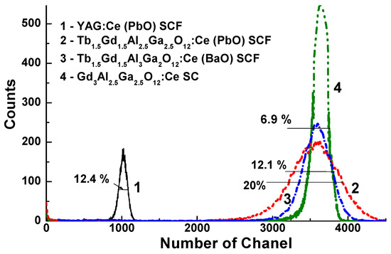 Figure 7. Pulse height spectra of Tb1.5Gd1.5Al2.5Ga2.5O12:Ce (PbO) (2) (LY = 1368 phels/MeV (380%); E = 20%) and Tb1.5Gd1.5Al3Ga2O12:Ce (BaO) (3) (LY = 1370 phels/MeV (380%); E = 12.1%) in comparison with YAG:Ce SCFs (1) (LY = 360 phels/MeV (100%), E = 12.4%) and Gd3Al2.5Ga2.5O12:Ce SC (4) (LY = 1375 phels/MeV (381%); E = 6.9%) excited by α-particles of 239Pu (5.15 MeV) source and registered with a shaping time of 14 μs.