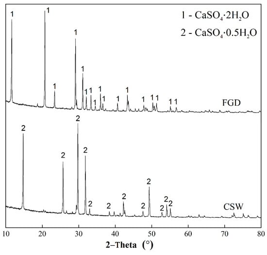 A study of the experimental data in Table 1 indicated that actual measured values of CSHW were pretty close to the raw material, meaning the hydrothermal method did not affect physical properties much. The FGD gypsum and CSHW were also chemically characterized and exhibited in Table 2. The chemical substances were both found to be inorganic in nature, and their contents rather similar. Besides, the main component was shown as calcium sulfate, due to the high content (more than 96%). In this research, the crystal water content of FGD gypsum was tested as 18.65 wt. %, which was approximate to the theoretical value of pure CSD (20.93 wt. %). Whereas, that of CSHW was 6.82 wt. %, similarly to pure CSH of 6.21 wt. % calculated from the chemical formulae. Thus, the large discrepancies in the hydration property between FGD gypsum and CSHW could be conceived as their different crystal morphologies and major ingredients.