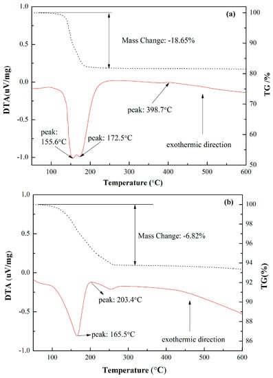 TG-DTA pattern of (a) FGD gypsum and (b) CSHW derived from FGD gypsum by the hydrothermal synthesis.