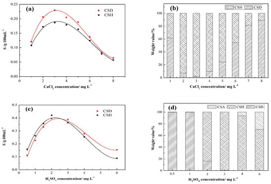 Figure 4d illustrates that CSHs are not produced until the sulfuric acid concentration increases to 2 M; thus, the solubility of CSH is greater than that of CSD at low sulfuric acid concentrations and should be responsible for the phenomenon depicted above, which corresponds with the result of Li [42]. Combined with Equations (5) and (6), the solubility values of CSH and CSD are equal at the sulfuric acid concentration of 2.59 M. Therefore, CSD would not dehydrate to CSH when the sulfuric acid concentration is below this specific value. However, excessive amounts of sulfuric acid trigger further dehydration reaction from CSH to CSA (anhydrite), finally reducing the purity and quality of final products to some extent. Deduced on the basis of Figure 4, both calcium chloride and sulfuric acid can increase the solubility difference between CSD and CSH, and the former can also push the crystal modification of CSHW. In summary, the formation of target product is easily promoted with the calcium chloride concentration of 2–5 M and sulfuric acid concentration of 2.59–4 M.