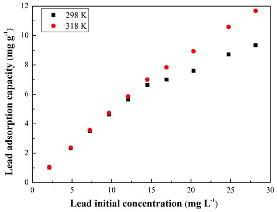 Figure 5 shows the adsorption isotherms of lead ions by CSHW at the temperature of 298 and 318 K. The adsorption isotherms were tested using 30 mg L−1 lead solutions with constant temperature. After the linear fitting, various parameters for equilibrium isotherms of lead ions on CSHW were calculated based on Equations (7)–(9), and the results are presented in Table 3. According to the value, the matching degree of the three selected models is in the descending order of Langmuir > Temkin > Freundlich at each temperature value. The high applicability of the Langmuir model may suggest that lead removal is controlled by the homogenous distribution of active sites on the CSHW surface.