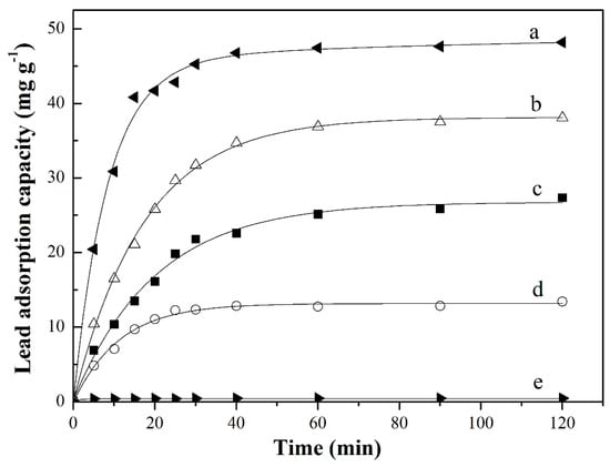 The characteristic curves of the initial lead concentration (10−100 mg L−1) versus time ranged in 0−120 min are drawn out and illustrated in Figure 6. Empirical equations were proposed and widely used to describe the sorption kinetics and verify the control mechanism underlying adsorption.