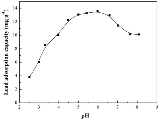 As revealed in Figure 7, the uptake amount of lead on CSHW increases rapidly from 3.80 mg g−1 to 13.55 mg g−1, and shows typical exponential growth with the increasing pH, from 2.51 to 5.98. After reaching a peak value of 13.55 mg g−1, the adsorption capacity decreases gradually to a relatively stable value of 11.77 mg g−1. When the pH is as extremely low as 2.5–3.3, the uptake amount of lead is less than 9 mg g−1, which could be explained by the surface properties of the adsorbent. At low pH, the large accumulated hydrogen ions exhibit strong affinity to CSHW in the solution. Consequently, the adsorbent surfaces are positively charged. When handled with similarly charged lead ions, the increasing shielding effect of the electrostatic repulsion induced by the addition of acid, should be considered in this adsorption state. In addition, the H+ competes with the sorption sites of the lead ions on the CSHW surface, thereby affecting the interface potential and the binding energy of the adsorbed species, and finally reducing the effective adsorption of lead in the solution [52]. With the increasing pH value, the CSHW surface possesses a high negative charge, which attracts lead ions. In general, the initial pH definitely influences the uptake of lead on the adsorbents in the solution.