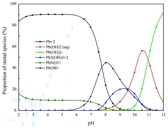 When the initial pH value is raised over 6.0, the Pb2+ species concentration remarkably decreases, and the concentrations of other lead species, such as Pb(OH)+, Pb3(OH)42− and Pb(OH)2 (aq) increase continually within the pH range [54]. This result is in agreement with the previous finding that 6.0 is the theoretical pH of initial precipitation for a 30 mg L−1 lead concentration [55]. More specifically, the lead removal efficiency is restricted due to the increment of hydroxyl products when the pH value exceeds 6.0, which should be responsible for the decreasing tendency of the lead removal efficiency. In a neutral environment, hydrolysis products, such as Pb(OH)+, would occupy the bonding sites, contend sulfate ions with Pb2+ species, and finally increase the soluble lead compounds in the solution.