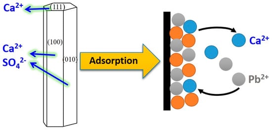 Figure 9 shows the schematic diagram for the adsorption process of lead ions on the CSHW. Once CSHW adds into the lead-containing wastewater, the lead ions bind to the crystal surface in at least two courses, namely, fast dispersion in the matrix, and progressive complexation with active groups on the surface of adsorbents. Their equilibrium is dependent on the experimental conditions. Actually, characteristic groups in the solution, such as Ca2+ ions, bind to the SO42− ions primarily through the ionic bonds on the CSHW surface. The characteristic structure of CSHW crystals reveals that Ca2+ ions are concentrated on the axial facets of (111), and the SO42− ions are preferentially distributed on the lateral facets of (010) and (100). Besides, the dipole on water molecules can trigger the electrostatic force on the crystals, which consequently results in that the (010) and (100) facets of the CSHW crystal are negatively charged, and are anticipated to combine tightly with the lead ions [60]. When the CSHW contacts the lead matrix, the lead ions occupy the active sites on the (010) and (100) facets to complex with SO42−, which further promotes the dissociation reaction on the surface of CSHW [61]. Furthermore, the dynamic process between Ca2+ and SO42− ions exacerbates their activities and heightens the driving force in the liquid phase. Finally, the CSHW achieves the optimal adsorption for the lead ions on the surface.