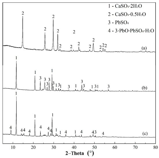 Figure 10 shows a component comparison of raw adsorbent and post adsorption products acquired at different pH values of 5.42 and 8.08 by using XRD determination. As a gypsum-based product, CSHW is an air hardening inorganic binding material. Once it has come into contact with water, the hydration transition occurs immediately, which can be clearly represented by the chemical reaction in Equation (12). Such a process is thought to be the primary way that the major ingredient of final product transforms from hemihydrate (CSH) to dihydrate (CSD), as seen in Figure 10. The final resultants, PbSO4 and 3PbO PbSO4 H2O, are separately detected at pH values of 5.42 and 8.08, respectively. That is to say, during adsorption, lead uptake capacity relies heavily on the pH of the system. Moreover, the optimum removal behavior is obtained at the initial pH of 5−6.5, which includes the actual value of the solution itself.