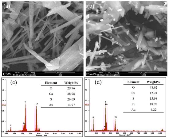 The SEM graphs and EDS spectra of CSHW before and after lead ion sorption are shown and contrasted in Figure 11. As shown in Figure 11a, the fresh CSHW is shaped with a kind of whisker morphology, and shows a growth advantage in the lateral facets due to the hydrothermal synthesis derived from FGD gypsum. The SEM image in Figure 11b revealed that a large amount of white substances are generated and dispersed on the surface of CSHW. Ascribed to the hydration reaction, calcium sulfate hemihydrates continued to be consumed and dihydrates were constantly renewed, embodying, specifically, the fact that crystals had obviously thickened up, compared with Figure 11a. The relative content percentages of particles obtained from EDS analysis are presented in Figure 10c,d. The calcium content of the post adsorption product is less than fresh CSHW, which indicated calcium ions are partially replaced and dissolved into the solution. In addition, element Pb appears, and the O content increases after the reaction, which supported the uptake of lead ions on the CSHW surface. Figure 11d shows that the white substance is mainly composed of lead compound with other various amounts of inorganic elements, indicating that complexation process is mainly involved in lead removal. Under relatively high lead concentrations, hydrolysis reactions should be considered because the major reacting process is probably dominated by homogeneous nucleation, which might change the final products [62].