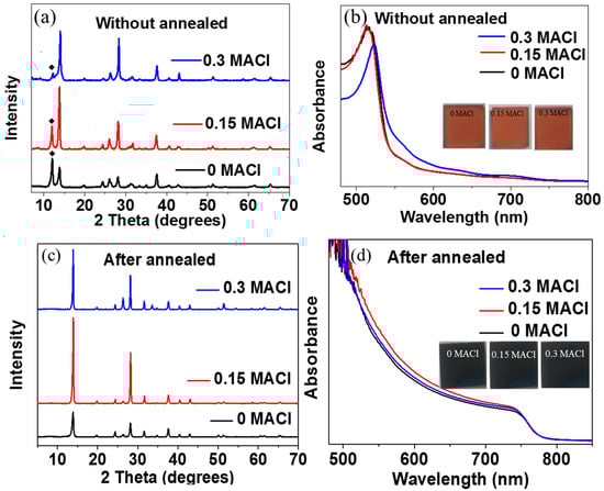 (a) The XRD patterns and (b) UV/Vis spectra of (FAPbI3)0.85(MAPbBr3)0.15 films using 0, 0.15 and 0.3 MACl additives (a,b) without having been annealed and (c,d) after having been annealed. Insert: Precursor film images. ◆: the peak of the intermediate.