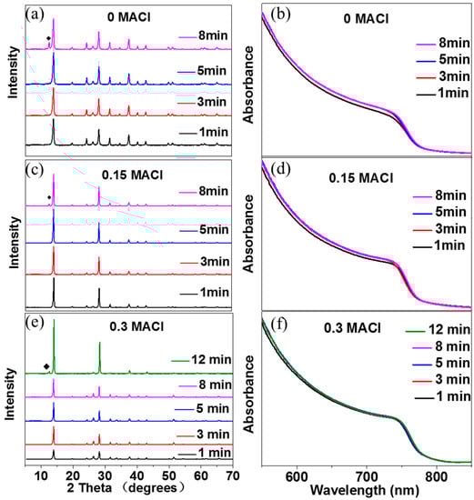 XRD patterns and UV/Vis spectra of (FAPbI3)0.85(MAPbBr3)0.15 films with (a,b) 0, (c,d) 0.15 and (e,f) 0.3 MACl annealed for 1 min, 3 min, 5 min and 8 min at 150 °C. ◆: PbI2.
