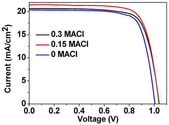 The typical J–V curves of the perovskite solar cells based on (FAPbI3)0.85(MAPbBr3)0.15 using different molar ratios of MACl additives.