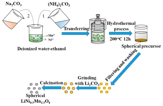 Diagrammatic illustration of the synthesis process for LiNi0.5Mn1.5O4 (LNMO) cathode materials.