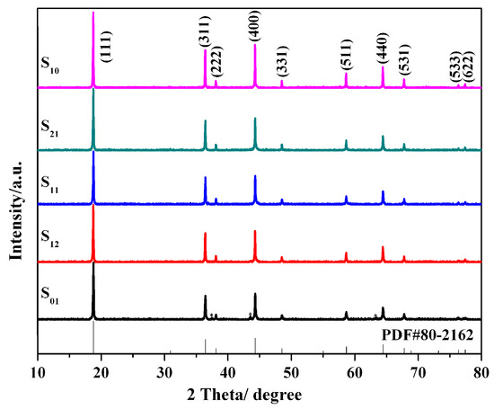 Figure 2 shows the XRD patterns of as-prepared LNMO materials. All the peaks can be assigned to a well-crystallized typical cubic spinel structure with a space group of Fd3m (JCPDS Card No. 80-2162). It is noteworthy that the additional minor XRD reflections at 2θ = 37.4°, 43.5°, and 63.2° can be observed on S01, which is assigned to small amounts of a rock salt phase [29]. We can observe from the pattern that the integrated intensity of S12, which is lower than those of S21 and S10, higher than that of S11, and similar to that of S01, reveals a medium crystallinity among the five samples. Meanwhile, the structural parameters and crystallite sizes are shown in Table 1. The S12 exhibits a lattice parameter of 8.1723 Å and a crystallite size of 256.8 nm, corresponding to the medium crystallinity, which may result in superior electrochemical performances.