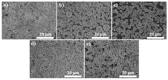 Low-resolution SEM images of spherical precursor prepared by mixed precipitants of (NH4)2CO3 and Na2CO3 with different molar ratios: (a) 0:1; (b) 1:2; (c) 1:1; (d) 2:1; (e) 1:0.