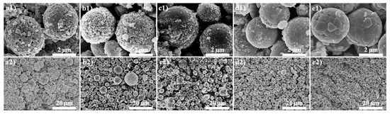 High- and low-resolution SEM images of (a1,a2) S01; (b1,b2) S12; (c1,c2) S11; (d1,d2) S21; (e1,e2) S10.