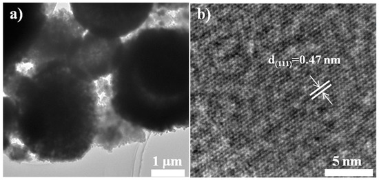 The phase analysis of as-prepared LNMO cathode material was performed via X-ray powder diffraction (XRD, Microdiffractometer D8 Advance, BrukerAXS, Karlsruhe, Baden-Wurttemberg, Germany). The morphologies and particle sizes were observed with a field emission scanning electron microscope (FESEM, S-4800, Hitachi, Blackwood, NJ, USA). The components of as-prepared materials were confirmed via inductive coupled plasma atomic emission spectrometry (ICP-MS, iCAP-Qc, Thermo Fisher Scientific, Waltham, MA, USA). The Brunauer–Emmett–Teller (BET) surface areas of the materials were determined via a physisorption and chemisorption analyzer (ASAP 2020-M+C, Micromeritics Instrument Corp, Atlanta, GA, USA). The microstructure, the chemical states of Ni and Mn elements, and the thermal gravimetric of the sample with the best electrochemical performance were respectively characterized with transmission electron microscopy (TEM, Tecnai G2 F20, FEI, Hillsboro, OR, USA), X-ray photoelectron spectroscopy (XPS, K-Alpha, Thermo Fisher Scientific, Waltham, MA, USA), and thermogravimetric analysis (TGA, STA449F3, Netzsch, Selb, Bavaria, Germany), respectively. When conducting the test of TEM, the preparation of the TEM specimen was as follows: firstly, the sample of LNMO was ultrasonically dispersed with ethanol for 40 min; secondly, the sample was filtered onto a copper screen; lastly, after drying, it was tested. XPS was performed under the following conditions: chamber pressure: 8 × 10−8 Pa; take-off angle: 90°; calibration: according to the standard C 1s spectrum with a binding energy of 284.6 eV, the test value of 283.48 eV for C 1 s spectrum was calibrated. The TGA was carried out from 35 to 900 °C at a heating rate of 10 °C/min. The structural parameters and crystallite size were calculated with JADE 6.5 software, which was based on the XRD data.