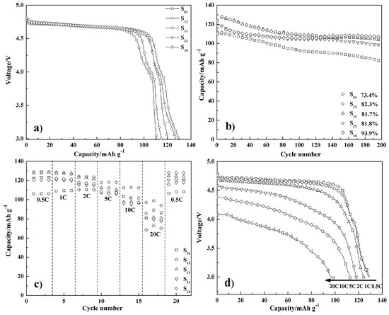 We can observe from Figure 7b that the discharge capacity retention of five samples respectively remain 73.4%, 82.3%, 81.7%, 81.8%, and 93.9% after 200 charge–discharge cycles at 0.5 C. S12 shows favorable cycling stability and S10 exhibits the best result, while S01 shows the worst cycling stability among all five LNMO cathode materials, which may also be ascribed to the broken spherical morphology. The LNMO cathode material with a relatively complete spherical morphology and higher crystallinity can exhibit better cycling stability, which could be attributed to the smaller contact area of the electrode–electrolyte. The small specific surface area will contribute to weakening the unexpected side reaction during the electrochemical process and mitigate the dissolution of transition metal ions [33]. Moreover, an increasing discharge capacity around the first 10 cycles can be observed from samples except S01, which indicates that a longer wetting and electrochemical activation process is necessary for micron-sized spherical particles [34].