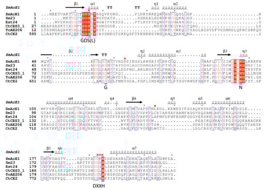 Sequence alignment of carbohydrate esterases. Sequence of SmAcE1 was compared with other structurally identified CEs (CE2: CtCE2 and CE3: Sm23, Est24, CtCES3-1 and TcAE206). In sequence alignment, only esterase domains were used for CtCE2 [29], CtCES3-1, and TcAE206, and the full sequence was used for SmAcE1. The predicted secondary structure of SmAcE1 was displayed on top of the aligned, and GDS(L) and DXXH motifs, which contain catalytic triad (Ser15, Asp195 and His192), were marked with motif names under each position. The oxyanion hole residues were highlighted using the blue bar and their name under the residues. The β-d-glucose-binding residues (Ser612, Tyr665, Trp746, Asp789, Trp790, and His791) in CtCE2 complex (PDB code: 2WOA [29]) were marked using red asterisks. Sequence identities of Sm23, Est24, CtCE2, CtCES3-1, and TcAE206 to SmAcE1 were 30.3%, 32.5%, 10.6%, 12.4%, and 9.5%, and sequence similarities of Sm23, Est24, CtCE2, CtCES3-1, and TcAE206 to SmAcE1 were 41.2%, 44.2%, 26.3%, 26.3%, and 22.6% in 274 of length of multiple sequence alignment.