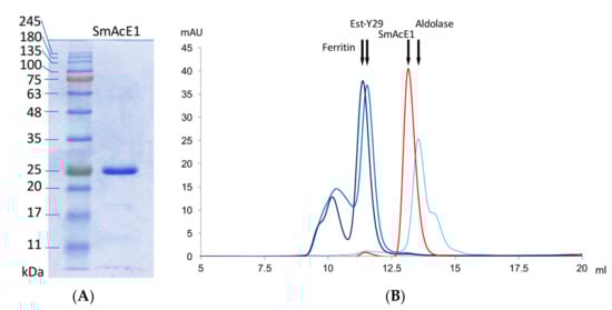 Characterization of the recombinant SmAcE1. (A) SDS-PAGE analysis of the purified SmAcE1. Molecular weight of purified SmAcE1 was estimated on SDS-PAGE analysis. The mobility of the protein size markers and SmAcE1 were displayed in first and the second lanes, respectively. The protein band of SmAcE1 is closely located to 25.7 kDa. (B) Analytical size-exclusion chromatography of SmAcE1 (red). Retention peaks of ferritin (440 kDa, deep blue), Est-Y29 (354 kDa, blue), and aldolase (158 kDa, light blue) were marked using black arrows. Molecular weight of SmAcE1 was estimated as ~185 kDa. Void volume of the column is 8.2 mL.