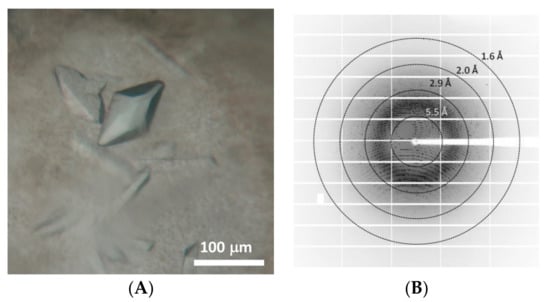 The purified SmAcE1 was crystallized using the microbatch method, by mixing 1 μL of protein (5 mg·mL−1) with 1 μL of mother liquor on a Nunc 72-well plate (Thermo Fisher Scientific, Roskilde, Denmark) under the Al’s Oil (Hampton Research, Aliso Viejo, CA, USA). Initial crystallization screening was performed using Crystal Screen I, Crystal Screen II, Crystal Screen Cryo, and StockOptions Salt Kits at 295 K. The crystallization conditions were further optimized by changing salt concentration and adding additives using the Additive Screen Kit (Hampton Research, Aliso Viejo, CA, USA).
