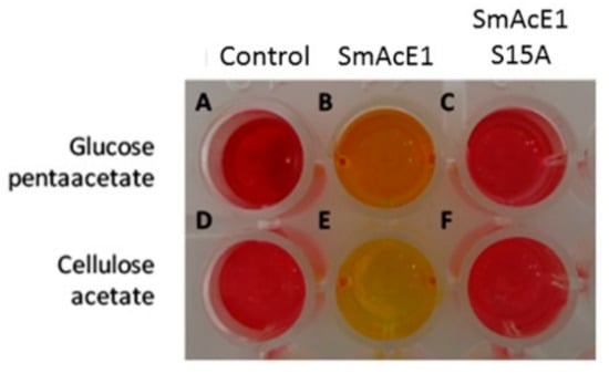 To examine the carbohydrate acetylesterase activity of the recombinant SmAcE1, two acetylated carbohydrates were employed as substrates: glucose pentaacetate and cellulose acetate. The catalytic activity of SmAcE1 was confirmed by the phenol red color assay, in which the color of solution turns yellow as the pH is lowered by the hydrolyzed acetates from the substrates. As shown in Figure 5, the wild-type SmAcE1 showed acetylesterase activity towards both substrates by showing the color change to yellow (Figure 5B,E) when compared to the control (Figure 5A,D). However, the mutant SmAcE1 (SmAcE1 S15A) did not show any color changes (Figure 5C,F).