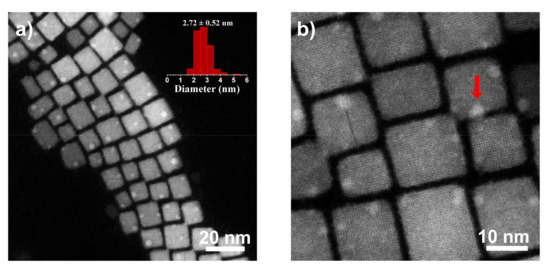An overview of the NPs on the CsPbBr3 NCs was first investigated using scanning TEM high-angle annular dark field (STEM-HAADF) images as shown in Figure 1. CsPbBr3 NCs of about 15 nm with cubic and rectangular shapes are demonstrated. The NPs on the CsPbBr3 NCs are of an average size of 2.72 ± 0.52 nm (inset of Figure 1a). These NPs have a tendency to locate near the edge of each CsPbBr3 NC and a NP bridging itself between two CsPbBr3 NCs has been even found (indicated with an arrow in Figure 1b), which suggests that these NPs do not locate inside the CsPbBr3 lattice, but are attached to the surface of CsPbBr3 NCs.