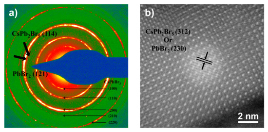 (a) SAED pattern of the NPs on the CsPbBr3 NCs. Arrowed spots can be identified as PbBr2 NPs and CsPb2Br5 NPs, excluding the main diffraction rings belonging to various CsPbBr3 planes. (b) High-resolution STEM-HAADF image of a CsPb2Br5 NP (a PbBr2 NP is also possible) formed on the CsPbBr3 NC (CsPbBr3, cubic phase, PDF#75-0412; PbBr2, orthorhombic phase, PDF#31-0679; CsPb2Br5, tetragonal phase, PDF#25-0211).