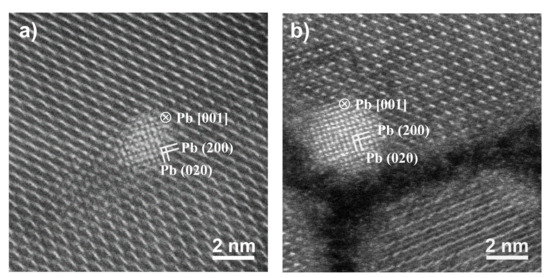 In addition, metallic Pb NPs were also found on CsPbBr3 NCs using high-resolution STEM-HAADF. Figure 3a,b shows the Pb (200) and Pb (020) atomic planes with a lattice spacing of 2.46 Å and an interfacial angle of 90°, oriented along a [001] zone axis. Since previous SAED results (Figure 2a) have implied no existence of metallic Pb, which contradicts the reported argument that metallic Pb NPs exist originally in the CsPbBr3 dispersions [26], the Pb NPs found here at a high magnification (electron dose 1.9 × 105 e−/Å2) may, to a large extent, originate from the as-reported electron radiation effect on CsPbBr3 lattice [23,24,25]. From Figure 3b, it is clear to see that the CsPbBr3 lattices under the as-observed Pb NP were modified and damaged. Therefore, we propose that the metallic Pb NPs observed here may not be the extraneous NPs, like the PbBr2 and CsPb2Br5 NPs, but rather a degradation product of CsPbBr3 NCs from the focused electron beam during TEM imaging.