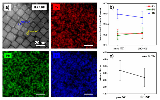(a) STEM-EDS raw counts mappings of CsPbBr3 NCs with the NPs. No strong variations of Cs, Pb, or Br are found in the position of the NPs. None of the auto-filter processing is applied here. (b) A plot of the calculated atomic percentages for Cs, Pb, and Br versus different regions (pure NC regions and NC+NP regions). We took an average of 10 quantified elemental atomic percentage results subtracted from 10 pure NC regions (i.e., indicated by a yellow circle in (a)). The error bar is the standard deviation. Similar calculations were applied to the NC+NP regions (i.e., indicated by a blue circle in (a)). (c) A plot of calculated atomic ratio of Br/Pb versus different regions (pure NC regions and NC+NP regions).