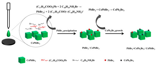 The precipitated PbBr2 NPs touch the CsPbBr3 NC surface and tend to facilitate the generation of CsPb2Br5 NPs, as illustrated in Figure 6.