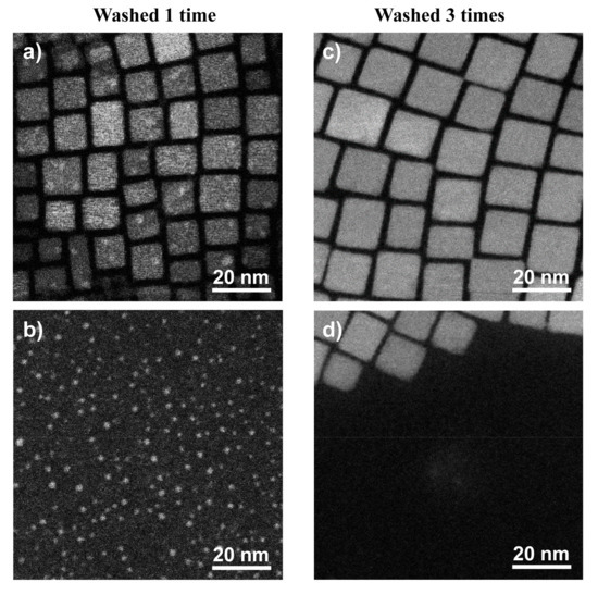 HAADF-STEM images of the distribution of the NPs on both CsPbBr3 NCs and carbon films for the sample washed one time (a,b) and the sample washed three times (c,d), respectively.