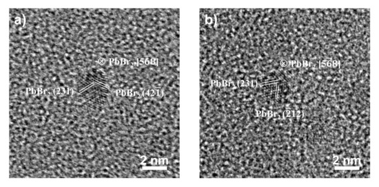 Recent studies have consistently reported the observation of nanoparticles (NPs) with high contrast to LHP nanocrystals (CH3NH3PbBr3 [21] and CsPbBr3 [22,23,24,25,26]) in transmission electron microscopy (TEM) images (i.e., the white dots in Figure 1). However, the structure, chemistry, and forming mechanism of these NPs are still unclear and under debate in these reports. Some reports indicate that these NPs are Pb metal, originating from either the precursor material PbBr2 [26], or the electron damaged CsPbBr3 lattices [23,24,25]. One report suggests that these NPs are PbBr2 [21] and another report claims that these NPs are CsPb2Br5 [22].