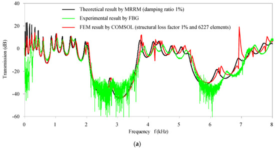 To verify the above-derived MRRM, we consider a defected phononic crystal beam with eight binary unit cells, as depicted in Figure 5a. The corresponding specimen actually made for the experiment is shown in Figure 5b. All unit cells in the considered structure consist of a PMMA (polymethyl methacrylate) beam and an aluminum beam with the same length . The defect is in the cross-sectional height of the PMMA constituent beam of the fifth unit cell counted from left. All the PMMA and aluminum beams have the cross-section of ( is the cross-sectional width), except that the PMMA beam in the defected unit cell has the cross-section of . The difference between the PMMA beams in the perfect and the defected unit cells can be clearly seen from the comparison in Figure 5a and from the contrast between Figure 5c,d. The geometrical and material parameters of these constituent beams are listed in Table 3 for the convenience of subsequent calculations. Among the geometrical parameters, the length and the cross-sectional dimensions are measured. Considering the cross-section is rectangular, the area and the second moment of inertia are calculated and the shear coefficient is directly specified. Among the material parameters, the Young’s modulus of the PMMA is experimentally obtained beforehand by matching the steel ball impact-induced frequency responses of a PMMA plate to those predicted by the finite element simulations [65]. All the other material parameters are given by referring to a materials handbook [71]. Note that, except the calculations in the following first part, the computations thenceforth do not consider the damping of the phononic crystal beam by setting all the damping ratios as zero. Also, for the convenience of engineering applications, the engineering frequency , the dimensionless wavenumber , and the decibel (dB) transmission are used hereafter.