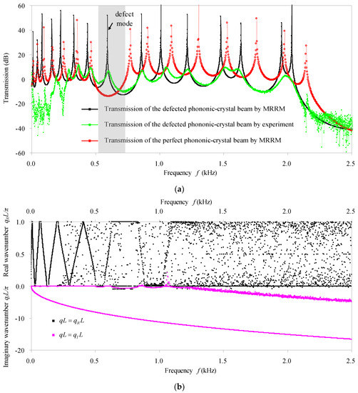 Figure 12a illustrates the zone folding effect [70] of the transmission spectra as the unit-cell number increases. Figure 12b demonstrates the folding of band structures by increasing the unit-cell number. Nevertheless, the folding does not occur in exactly corresponding frequency ranges, since the defect also influences the evolution of transmission spectra and band structures of the defect phononic crystal beam. In a fixed frequency range, the transmission spectra of the defect phononic crystal beam with more units of cells show more resonant peaks due to more occurrence of wave scattering. In general, the more are the units cells in the finite phononic crystal beam with defect, the more and narrower are the frequency bands in a specified frequency range.