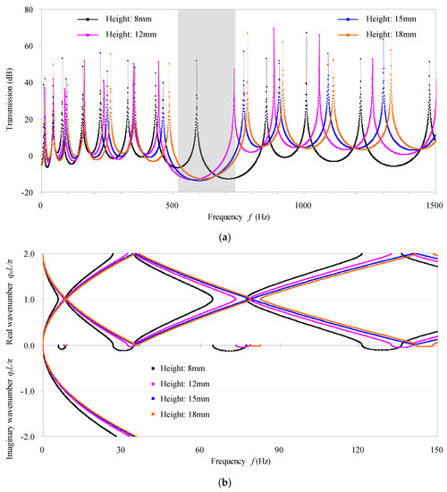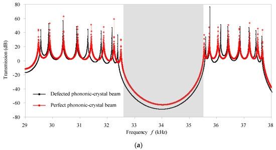 Figure 10a illustrates that, referring to the transmission spectra of the benchmark perfect phononic crystal beam, the transmission spectra of the defected phononic crystal beam move toward higher and lower frequency sides as the defects are introduced by respectively increasing and decreasing the cross-sectional height of the left beam in the fifth unit cell. This is due to the increasing and decreasing of the resonant frequencies of the finite structure in the two defected cases, whose reason has been discussed after Figure 6. It is interesting to note that defect mode occurs as the height reduces to as low as and . However, defect mode does not appear as the height enlarges to , because the resonant frequency that is very close to the high bounding frequency of the passband has not shifted into the adjacent higher-frequency stopband of the original perfect phononic crystal beam. Figure 10b,c shows that the defect introduces new stopbands within the original passband of the perfect phononic crystal beam by opening the phase constant spectra at ( is an integer) and by slightly changing the shape in-between adjacent . As the defect is formed by reducing the cross-sectional dimension, the phase constant spectra generally move toward the lower frequency side during the process of opening at and of slightly changing the shape in between adjacent . This is because that the flexural and shear stiffness of the structural beam decrease much more obviously than the decreasing of rotary and transversal inertias as the cross-sectional dimension reduces. Thus, the characteristic frequencies of the whole system decrease. The greater the reduction, the lower the characteristic frequencies of the whole system are, and the farther is the movement of the phase constant spectra. However, a different order of phase constant spectrum moves at different rate, thus new stopbands with various bandgaps forms between adjacent phase constant spectra. For the newly introduced stopbands, the band gaps are generally wider and the stopband central frequencies are generally lower as the defect degree is bigger. Forming the defect by increasing the cross-sectional dimension shows opposite influence rule except that ‘the bigger the defect degree, the wider the stopbands’ still holds. At the same time, a new passband may occur within the original stopband of the perfect phononic crystal beam, as seen from the spectra associated with or height. This is due to the fact that introducing a defect causes the original different orders of phase constant spectra to move at different degrees, and coincidently some phase constant spectra may move into one original stopband to form new defect modes. Consequently, there is also a possibility that no phase constant spectra move into the original stopband, as can be seen from the spectra associated with a height of .