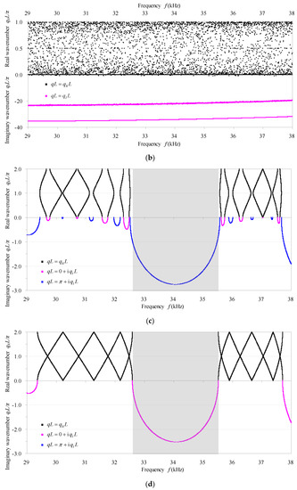 where and are the complex propagation constant and wavenumber of characteristic wave in the supercell respectively, and is the length of the supercell. The imaginary and the real parts of denoting by and , i.e., the real and the imaginary parts of denoting by and , are known as the phase constant and the attenuation constant, respectively. It should be stated that both and can be used to represent the feature of the characteristic wave, the wavenumber is preferred in our study for its closer connection to the wavelength and phase velocity.