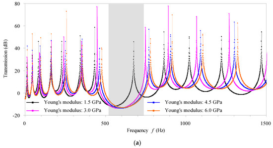 As all the geometrical and material parameters remain the same as those in Table 3, the unit-cell number of the defected phononic crystal beam varies from into , and to inspect the effect of unit-cell number on the transmission spectra and the band structures. The defect PMMA beam in all the four cases is located next to and on the right side of the finite structure center. The transmission spectra and the band structures within of the four defected phononic crystal beams (with two, four, six, and eight unit cells) are given and compared in Figure 12a,b, respectively.