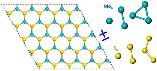 Indeed, the magnetic incident carriers are not only limited to the hereto-elemental clusters, but can also be found in the composites themselves. The “doping element into compound” route originates from the fact that most chemical reactions are accompanied with either redundant or deficient chemicals during synthesis, which results in a positive or negative influence on the final material properties. The synthetic route for MoS2 brings non-stoichiometric products globally or locally. These defective parts may also bring magnetism into the 2D system. For instance, the free Mo clusters are famous for their tunable magnetism [,], and the S clusters for their abundant geometric structures []. Thus, using clusters composed of compositional elements as the dopants is another strategy to find the ILC magnetism []. The schematic illustration of the route is shown in Figure 2, where the Mon or Sn (n = 1–3) clusters are added on or brought out from the MoS2 monolayer. Similar to Reference [], theoretical modeling and computations were employed in first-principles predictions of magnetisms on the defective or redundant MoS2 monolayer. The results show that adsorbing the Mon (n = 1–3) clusters on the slab can also lead to the magnetism of the systems, but the substance only has a relatively low MM, up to 3 μB.