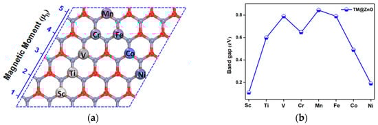 Magnetic moments and bandgap of transition metal (TM) adsorbed on the ZnO monolayer complex. (a) The most stable adsorption sites and total magnetic moment of the TM-adsorbed complex; (b) Bandgap of the complex.
