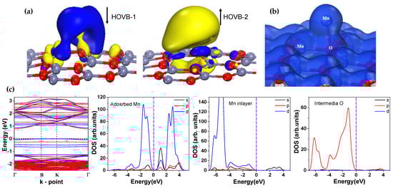 Orbitals of the highest occupied valence band (HOVB) in the Mn adsorbed-doped ZnO monolayers (a); electronic charge density (b); and electronic structures (c) []. Copyright © (2017) American Chemical Society (ACS), http://pubs.acs.org/doi/full/10.1021/acsomega.7b00093. Reproduced with permission from ACS. Further permission related to the excerpted material should be directed to the ACS.
