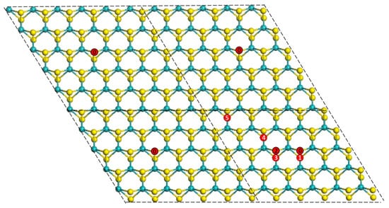 Dimensionality reduction, by reducing the spatial variables, introduces spatial symmetry effects into the doped ILC systems. As another basic concept, space symmetry is found to substantially influence the final magnetism. In the dually doped MoS2 complexes, a general trend illustrates that spatial symmetry leads the broken symmetries in magnetism. This is seen in the dually doped system when two Cr impurities are placed mirror symmetric to each other through the MoS2 monolayer (noted as TM0 and TM1 positions in Figure 5). The high symmetric configuration creates AFM in the double-sided doped system. Compared with the magnetic interactions between ions, such a geometric influence follows the symmetry of the systems. By extending the supercell to 10 × 10, as shown in Figure 5, the configuration of V(0)–MoS2–Co(5) is more symmetric compared with that of V(0)–MoS2–Co(4). Position (5) is almost in the middle of the four slabs of 5 × 5 dimensions. Such a symmetry of the V(0)–MoS2–Co(5) case resulted in a stronger AFM trend. This serves a bigger exchange energy value in the absolute scale [].