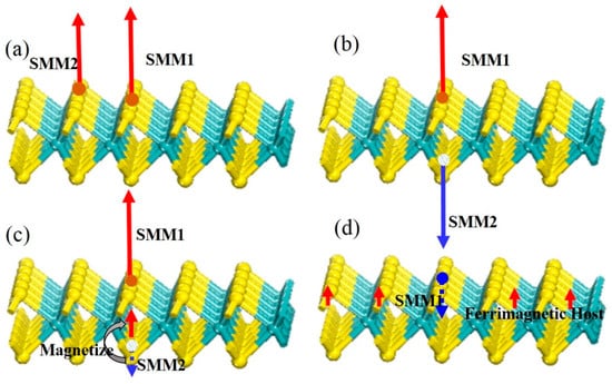 Single molecular magnet (SMM) interaction schemes. (a) Two ferromagnetic SMMs are placed on the same side of the MoS2 host; and (b) placed exactly mirror symmetric to each other; (c) one ferrimagnetic SMM is magnetized by the top ferromagnetic SMM; and (d) denotes the antiferromagnetic interactions between a ferrimagnetic SMM and a ferrimagnetic substrate.